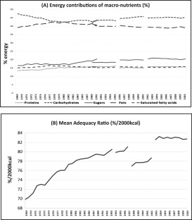 Time-series of food-at-home purchases from representative samples of French households were built based on two sources of data: the INSEE National Food Survey (1969–1991) and the Kantar Food Consumption Panel (1989–2010). Food-at-home purchases were converted into energy and nutrients using the French CIQUAL food composition table. The nutritional quality of food-at-home purchases was estimated using the mean adequacy ratio (MAR) for 15 key nutrients. MAR was expressed per 2000 kcal to assess the nutrient density of food-at-home purchases.