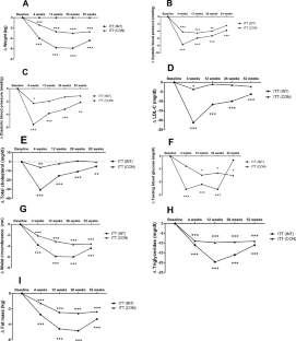 From the starting cohort 360 (78%, INT: n = 244; CON: n = 116) and 317 (68%, INT: n = 216; CON: n = 101) participants completed the 26-weeks intervention phase and the 52-weeks follow-up. The estimated treatment difference (ETD) between both groups was −3.2 kg [−4.0; −2.5] (P < 0.001) after 12 weeks and −1.8 kg [−2.8; −0.8] (P < 0.001) after 52 weeks.
