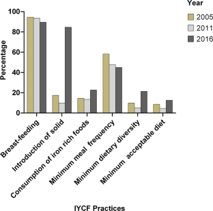 The prevalence of stunting among children aged 6–23 months in Ethiopia decreased greatly from 49% in 2005 to 32% in 2016. Among the IYCF practices, consumption of iron-rich foods, minimum dietary diversity (MDD), and minimum acceptable diet (MAD) were significant predictors of stunting. In addition, the prevalence of anaemia declined significantly from 26% in 2005 to 16% in 2011, but increased to 29% in 2016. Among the IYCF practices, breastfeeding and minimum meal frequency (MMF) had lower odds of childhood anaemia.
