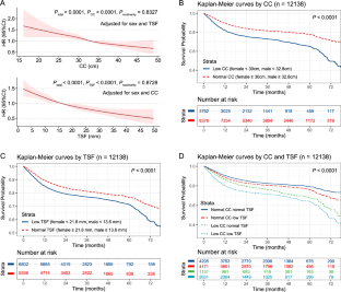 The study included 5744 females and 6394 males with a mean age of 56.9 years. The CC and TSF were identified as better mortality predictors than other AMs. The optimal thresholds were women 30 cm and men 32.8 cm for the CC, and women 21.8 mm and men 13.6 mm for the TSF. Patients in the low CC or low TSF group had a 13% (HR = 1.13, 95% CI = 1.03–1.23) and 22% (HR = 1.22, 95% CI = 1.12–1.32) greater mortality risk compared with their normal CC/TSF counterparties, respectively. Concurrent low CC and low TSF showed potential joint effect on mortality risk (HR = 1.39, 95% CI = 1.25–1.55).