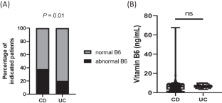 A total of 360 CD patients and 55 ulcerative colitis (UC) patients from Shanghai Tenth People’s Hospital of Tongji University were included. Serum vitamin B6 concentrations were collected from the computerized laboratory data. The logistic regression was used for statistical analysis. Fecal-associated microbiota was also analyzed using 16S rRNA sequencing in another 20 CD patients (10 of vitamin B6 normal, 10 of vitamin B6 deficiency).