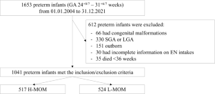 Clinical data of AGA preterm infants (24+0/7–31+6/7 weeks) were reviewed. Infants with ≥66% of cumulative prescribed enteral volumes as MOM from birth to 36 weeks were allocated to the high provision of MOM group (H-MOM), whereas those with <66% were assigned to the low provision of MOM group (L-MOM). Multiple regressions were used to assess the association of H-MOM with BPD and oxygen saturation to fraction inspired oxygen ratio (SFR) at 36 weeks.