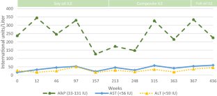 Three cases of IFALD treated with FO ILE were identified. The first case was a 30-year-old man with short bowel syndrome (SBS), hyperbilirubinemia, and biopsy-proven IFALD. Following a change from a soy lipid emulsion to FO lipid emulsion, his liver tests rapidly improved and remained stable over 202 weeks of use. The second case was a 76-year-old woman with intestinal failure (IF) due to a frozen bowel. A change from a soy ILE to a composite lipid and later to a pure FO ILE did not result in improvement in her liver tests. The third case was a 28-year-old man with SBS and biopsy-proven IFALD. Change to a composite ILE and subsequently FO lipid emulsion resulted in a gradual improvement in liver tests. No clinical essential fatty acid (EFA) deficiencies were identified during treatment.