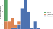 The Australian Eating Food Survey (AES®) food frequency questionnaire (FFQ) was used to measure qualitative intake of food groups per day. The AES® has been validated in Australian populations and is an online self-administered 120-question FFQ which examines food and nutrient intake over the preceding 3–6 months [33, 34]. The assessment of habitual intake of food items relating to a food category over a longer period of time is most accurately determined using FFQs [35]. The AES® FFQ offers 6–8 options for the daily, weekly, or monthly intake of foods ranging from ‘Never’, ‘less than 1 per month’, ‘1–3 per month’, ‘1 per week’, ‘2–6 per week’, ‘1 per day’, ‘2–3 per day’ and ‘4 or more per day’. Frequency of foods consumed were converted to daily equivalents and the total reported intakes of all questions related to a specific food group was recorded. There were 19 questions related to vegetables, 11 related to fruit, 22 related to grains, 29 related to ‘protein-rich foods’ (meats, poultry, seafood, eggs, legumes and nuts), 9 related to animal-based dairy’ and 26 related to discretionary foods (including sugar sweetened beverages). Daily intake of food groups and food categories were compared to the Australian Guide to Healthy Eating (AGTHE) recommendations. Recomended daily food group serves used to calculate adequacy were based on the appropriate age and sex recommendations for each participant. There is currently no available validated FFQ which evaluates consumption of various plant-based meat alternatives (PBMAs) and plant-based dairy alternatives (PBDAs). In the absence of this, an Accredited Practicing Dietitian (APD) administered an in-person FFQ which followed the same closed question format used in the AES FFQ® to obtain intake of PBMAs and PBDAs. Participants were asked ‘How often do you have the following plant-based alternatives’ for meat, milk, yoghurt, cheese, and ice-cream (5 questions). Dietitian-administered FFQ have been considered more accurate that self-administered FFQs [36]. The Australian Recommended Food Scores (ARFS) were used to investigate diet quality across groups [37].