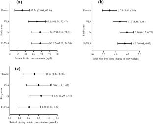 At baseline, prevalence of anemia (Hb < 11.0 g/dL), iron deficiency (sTfR > 8.3 mg/L or sF < 15 μg/L), iron-deficiency anemia, and vitamin A deficiency (RBP < 0.7 μmol/L) were 27.8%, 21.7%, 6.3% and 12.2%, respectively. Both iron and vitamin A supplementation had no significant effect on Hb, sTfR, and RBP concentrations. Supplementing iron weekly significantly increased sF (6.86 μg/L, 95%CI: 1.67, 12.05) and total body iron (0.45 mg/Kg, 95%CI: 0.17, 0.74), while semestrial vitamin A supplementation had no significant effect on both sF and total body iron.
