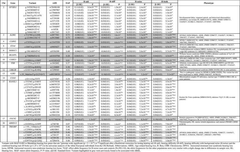 Table 3 Variants (MAF > 0.005) in Mendelian Traits genes with genome-wide significant associations with age-related hearing loss phenotype.