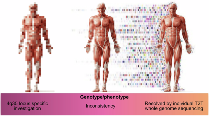 FSHD exemplifies the difficulty of reconciling genetic architecture with clinical expression. While contraction of the 4q35 array below eight units on a permissive 4qA allele remains the strongest FSHD diagnostic marker [3], reduced arrays are relatively common in the general population ( ~ 3%) [40] and even more frequent in haplotype-resolved pangenomes (4,6%) [18, 20]. Thus, many carriers remain asymptomatic or present non-FSHD myopathic phenotypes, whereas some symptomatic individuals present with borderline or normal repeat sizes [41,42,43]. These observations underscore that the size of D4Z4 array alone cannot explain disease penetrance or progression, and that additional modifiers must be involved.