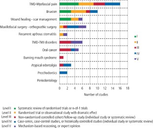Data extraction The highest level of evidence (LOE) behind BoNTA safety and efficacy was for wound healing and scar management in the orofacial surgery context, where BoNTA was presented as an adjunctive modality. Level-I evidence was controversial for temporomandibular disorders and bruxism. However, it showed promising results for painful temporomandibular disorders of myogenic origin refractory to conservative therapies, and to decrease muscle contraction intensity in sleeping bruxism. There was only one level-II study for persistent recurrent aphthous stomatitis. Data showed limited level-III evidence for orofacial pain conditions (temporomandibular joint recurrent dislocation and pain, burning mouth syndrome or atypical odontalgia), oral cancer complications, or as an adjuvant to maxillofacial and orthognathic surgeries. Benefits of BoNTA in prosthodontics had weak level-IV evidence. No evidence was found among the periodontology field.