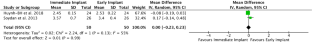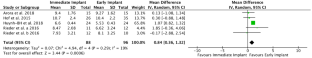A total of six studies were selected. Implant failure was observed at 3.84%, 9.3%, and 4.45% in three studies while in the other studies, no implant failure was reported. Meta-analysis of four studies showed no statistically significant difference in the vertical bone levels between IIP and EIP (148 patients), mean difference (MD)0.10 [95% CI: –0.29 to 0.091.32] P > 0.05. Meta-analysis of two studies showed the probing depth between IIP versus EIP was not significantly different (100 patients), mean difference(MD)-0.00 [95% CI; –0.23 to 0.23]; P > 0.05. The pink aesthetic score (PES) was improved in EIP as compared to IIP with a statistically significant difference (P < 0.05).