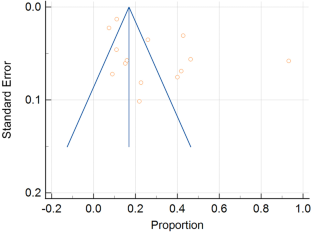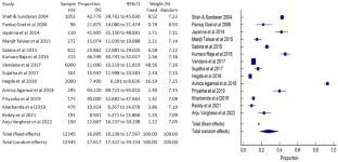 The search turned up a total of 194 articles; however, only 14 of those matched the requirements for inclusion and were used to compile the meta-analysis. MedCalc® Statistical Software version 20.2 was used to determine the pooled estimates. Using the random effect model, the analysis was carried out. By estimating the heterogeneity using Higgins’ I2 statistics, the extent and importance of differences between the chosen studies were ascertained. Publication bias was assessed using the funnel plot and Egger’s test. The random effects model yielded a pooled prevalence of 27.617 (95% CI = 17.422–39.154).