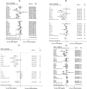 To compare the difference of marginal level changes (MBL), implant failure (IF), biological and prosthetic complications (BC and PC), and prosthetic failure (PF) of short implants (SH) and standard implants (ST).
