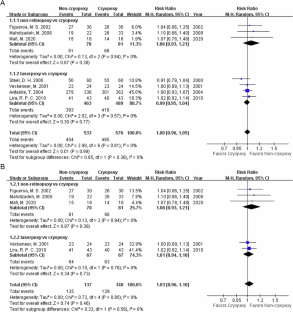 We included seven RCTs involving a total of 1103 patients. The meta-analysis revealed comparable retinal reattachment rates between noncryopexy and cryopexy methods (RR: 1.00; 95% CI: 0.96–1.05). Our subgroup analysis revealed similar results between nonretinopexy and laser retinopexy subgroups. Moreover, postoperative visual acuity (VA) and complication rates were comparable between noncryopexy and cryopexy methods (proportion of eyes with postoperative VA of 20/40 or better: RR: 1.24, 95% CI: 0.83–1.85; macular pucker: RR: 1.08, 95% CI: 0.53–2.21; cystoid macular oedema: RR: 1.01, 95% CI: 0.79–1.30; and subretinal pigmentary migration: RR: 0.34, 95% CI: 0.08–1.38). However, the certainty of evidence for these outcomes was low to very low, indicating the need for cautious interpretation of these findings.