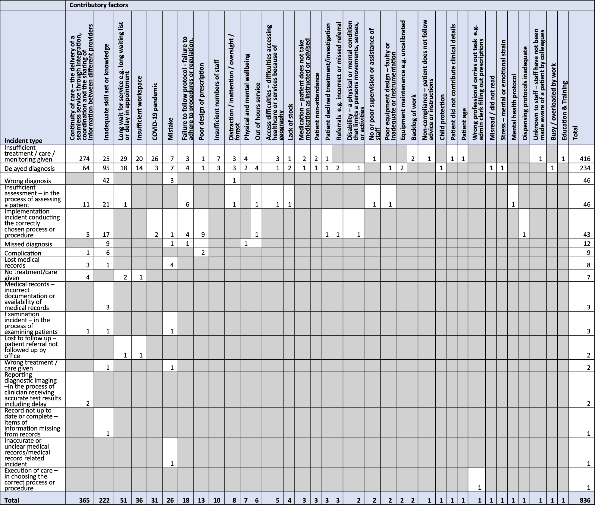 Table 3 Distribution of all possible combinations of incidents and contributory factors.