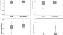 In an attempt to evaluate ICA parameters, all children in the study underwent imaging with a SD-OCT device (Solix full-range OCT, Optovue Inc., Freemont, CA, USA) with a scan speed of 120,000 A-scans per second, an 840 nm laser diode and a 5 µm axial resolution performed in the same dark room (mesopic) conditions. All the images in the study were obtained by an experienced technician with the patient sitting upright, keeping the eyes open as wide as possible. The temporal limbus was imaged after adjustment of the participant’s fixation to the nasal area. External fixation target of the device was also used to guide participant fixation. OCT scans were obtained using a 16-mm corneal lens adapter (cornea anterior module [CAM]), fixed in front of the ocular lens, in order to help to image the ICA with the software of the device set to Angle mode. In this mode, on a 3-mm line centred at the limbus, 32 B-scans each comprising 1024 A-scans were automatically obtained with a 0.04 second of duration for each B-scan. Images of a quality defined by a signal strength intensity above 30 were used for the final analysis. Measurements of all ICA parameters were made manually on these images using the software of the device based on the definitions in previous literature data [7, 10]. SCD was defined as the axial length of the oblong-elliptic, thin, lucent and hyporeflective space, generally located close to the trabecular meshwork outside and posterior to it. ACA was measured by tracing a line from the angle recess to the Schwalbe’s line and another line on the surface of the iris to the perpendicular point on the Schwalbe’s line. AOD and TISA were measured using the TISA/AOD Measurement Tool Angle Scan already set in the software of the device according to the manufacturer’s user manual. The number 500 or 750 is the distance (in µm) measured between the two upper points along the posterior cornea surface. One of these two upper points were located on the SS and the other one on the posterior cornea surface 500 or 750 μm away from SS. The AOD is the distance from cornea to iris. The area is measured as the trapezoidal area encompassed by these four points. Apart from these, SSL was also measured in two different previously reported methods [11]. In method 1 (SSL-1), the measurement was taken from the tip of the SS to the level of the posterior end of SC, along the anterior side of the SS [12]. In method 2 (SSL-2), the measurement was taken from the tip of the SS, directly to the level of the posterior end of SC [13]. IT was analysed with the software of the device set to Full range AC mode using a 18-mm CAM lens. IT was measured as the distances between the anterior and posterior iris surface, at 1 mm (IT-1), 2 mm (IT-2) and 3 mm (IT-3) from the edge of the pupil. Figures 1, 2 demonstrate representative measurements of the ICA parameters on SD-OCT in the study. One experienced observer (M.G.) took three consecutive measurements on the same SD-OCT images for each parameter at different measurement sessions, and the average of these measurements were used in the analysis. Furthermore, to determine intra-observer reproducibility in the study, the same consecutive measurements were also used.