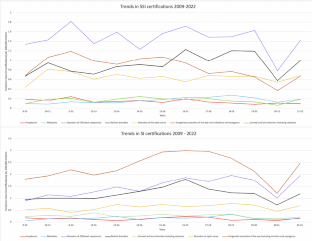 CVI data provided by the Certifications Office, was extracted and assessed to identify the various causes of mild-moderate (SI) and severe (SSI) visual impairment between 2009–2022. The data was classified into 11 broad groups which were similar in pathology. Incidence data was calculated using the official Census data. Byar’s method was used to calculate confidence intervals to determine significant changes in the number of new registrations in 4 early intervals amongst conditions that recorded >5 registrations in every year or the study.