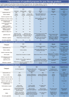 Gene therapy products (GTPs) used for incurable diseases can be expedited for early commercialization to fulfill unmet needs. This study analyzed the expedited programs available for GTPs in the US, EU, Japan, and South Korea using their regulatory authorities’ websites, related regulations, and documents. In total, there were five expedited programs available for GTPs in the US, four in the EU, and three in both Japan and South Korea, of which four are tailored for GTPs. These programs, sharing similar objectives, can be categorized as those expediting drug development, review, and approval. However, variations are observed in eligibility criteria, specific benefits, and post-marketing study conditions across regulatory authorities. Additionally, the criteria for orphan drug designation for a rare disease differs in prevalence thresholds, incentive offered, and marketing exclusivity period. Overall, 19 GTPs were approved–13 in the US, 14 in the EU, eight in Japan, and three in South Korea–with majority obtaining regulatory approval through at least one expedited program. Therefore, future studies can analyze whether acquiring multiple expedited programs accelerates the drug development and commercialization of GTPs compared with when only one expedited program is processed. Additionally, inter-authority scientific discussion is encouraged for harmonization of expedited program requirements.