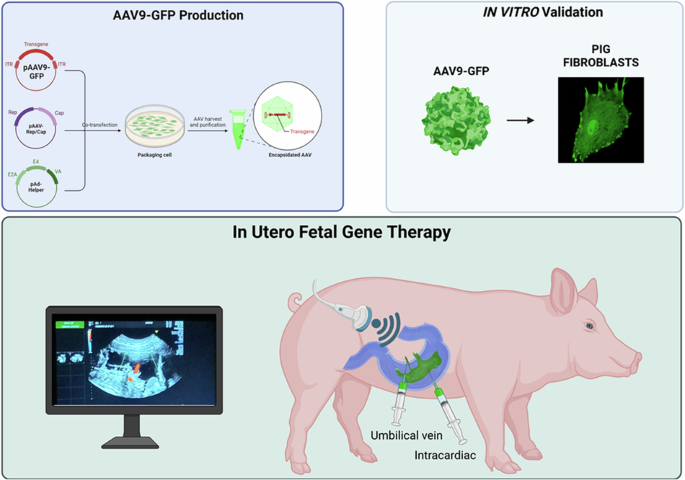 In this context, in utero fetal gene therapy has emerged as a groundbreaking approach that can potentially address genetic anomalies and congenital disorders at their earliest stages of development. Many proof-of-concept IUFGT studies have been performed in mice due to the large availability of disease models, multiparity, and lower costs. However, from a translational point of view, large animals represent a better model for setting up a precision medicine procedure like IUFGT. For this reason, sheep and non-human primates were used in pioneering IUFGT studies. Nevertheless, both models have only 1–2 fetuses per pregnancy and a reduced availability of genetic models of diseases. In our study, we used the pig as a model to set up an IUFGT technique by transabdominal ultrasound-guided injection of scAAV9-GFP in the umbilical vein or in the heart of fetuses. To the best of our knowledge, only two studies have evaluated the transduction efficiency, distribution pattern, and safety of AAV9 after in-utero fetal systemic injection in pigs.