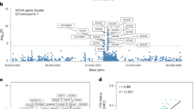 Among the pairs with the most pronounced difference in percent methylation were two CpG sites associated with the variant rs142180914 in an intergenic region, which showed increasing DNA methylation with increasing numbers of reference alleles (Fig. 4b). Remarkably, the only samples homozygous for the alternate allele were from infants with DE. We also observed four CpG loci that were strongly correlated with the intronic variant rs389729 in TRIO, but showed a decrease in methylation for each additional reference allele (Fig. 4c). In this case, all individuals homozygous for the alternate allele were diabetes-unexposed controls. Although neither rs142180914 nor rs389729 are currently known to affect gene expression, the high proportion of eQTLs among our SNV-CpG pairs with evidence of ASM at differentially methylated loci suggests that common genetic variants could contribute to an individual’s predisposition to develop DE upon prenatal exposure to maternal diabetes.