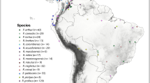 Similar to the phylogenetic analyses, major genetic clusters inferred by ADMIXTURE were geographically coherent, each restricted to a certain portion of South America. Specifically, the cluster composed of samples assigned to R. major was restricted to the Amazon region; the cluster composed of R. merianae, R. humbolti, and R. centralis samples was distributed across the Amazon and the Northern Andes; the cluster composed of samples assigned to R. granulosa was distributed across the Northern Atlantic Forest in eastern Brazil; and the cluster composed of samples assigned to R. mirandaribeiroi was distributed across the Cerrado in central Brazil (Fig. 3). The spatially explicit TESS3r resulting maps showing the diffusion of ancestry coefficients across geographic space shows genetic groups are geographically clustered for K = 4–6 (Fig. 2C).