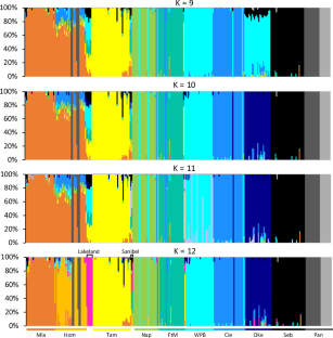 Alexander DH, Lange K (2011) Enhancements to the ADMIXTURE algorithm for individual ancestry estimation. BMC Bioinfo 12:246.