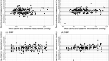 Data were analyzed according to criteria 1 and 2 required by the ISO standard [19]. For criterion 1, each test device measurement value was compared with the corresponding observer measurement. The differences between the test device and observer SBP and DBP measurements were calculated using the mean and standard deviation (SD). Bland–Altman plots were used to show deviations in the data [23]. For criterion 2, the mean and SD of each paired BP measurement (test device and observer) was calculated individually for each participant and compared.