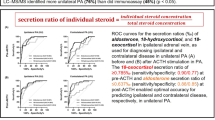The decision to offer surgery was mainly based on the combination of three criteria: (1) unilateral adrenal vein aldosterone concentration ≥14,000 pg/mL [4], (2) postcosyntropin LR ≥ 2.6 [4, 15], and (3) postcosyntropin CR < 1.0 [19, 20]. Precosyntropin indices and CT findings, and the presence of adrenal nodules or hypertrophy were also considered in the decision to offer unilateral adrenalectomy. Histopathology was examined on the postoperative specimen to confirm aldosterone-producing adenoma or hypertrophy.