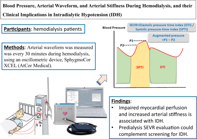 This study included 152 hemodialysis patients (mean age, 69 years; 34.2% female) and investigated serial changes in blood pressure (BP) and arterial stiffness indices during hemodialysis using an oscillometric device, SphygmoCor XCEL, and examined whether assessment of the arterial waveform has clinical implications for the management of intradialytic hypotension (IDH). Measurement was performed every 30 min during hemodialysis, and the threshold defining IDH was systolic BP (SBP) decrease ≥40 mmHg or a requirement for antihypotensive medication in all patients and ≥ the 75th percentile of maximum SBP decrease during hemodialysis (≥34 mmHg) in the subgroup without antihypotensive medication (n = 98). In all patients, a 1-standard deviation (SD) increase in the baseline subendocardial viability ratio (SEVR), an index of myocardial perfusion, was an independent predictor of IDH (odds ratio [OR] 0.43, p < 0.001). In the subgroup analysis, a serial change in SBP and all arterial waveform indices, including the augmentation index, augmented pressure (AP), and SEVR, during hemodialysis were greater for IDH than for non-IDH patients (all p < 0.01 by 2-way repeated-measures ANOVA), with the exception of heart rate (p = 0.40) and diastolic pressure time index (p = 0.21). Diabetes (OR 4.08), a 1-SD increase in ultrafiltration rate (OR 2.07), fractional shortening (OR 0.45), baseline SEVR (OR 0.36) and the first 1-h percent change in AP (OR 0.52) were independent predictors of IDH (all p < 0.05). In conclusion, impaired myocardial perfusion and increased arterial stiffness, particularly poor arteriolar responsiveness to acute dialysis-related changes, are associated with IDH, and predialysis SEVR evaluation can complement screening for IDH.