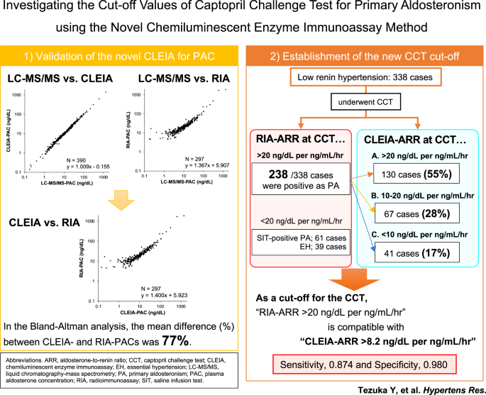Recently, novel chemiluminescent enzyme immunoassays (CLEIAs) have been developed for commercial measurement of plasma aldosterone concentrations (PACs). This method reportedly has high sensitivity and reproducibility [14]. These assays have been proven to have a very high measurement accuracy that is compatible with that of the gold standard method, liquid-chromatography mass-spectrometry (LC-MS/MS) [15, 16]. The regression coefficient between the CLEIA and LC-MS/MS methods reportedly ranges between 0.98 and 1.07 with a smaller intercept than 1 ng/dL [14,15,16], indicating that the novel CLEIA methods can be used as alternate standard for PACs. Applying the CLEIAs to everyday practice, the Japan Endocrine Society proposed new criteria for PA screening and confirmatory tests [13]. However, the validation of those PA-diagnostic cut-offs has not been sufficiently performed. No study has compared PACs using the CLEIA and conventional radioimmunoassay (RIA) methods in the same blood samples obtained from confirmatory tests. The transition of PAC measurement from RIA to CLEIA could interfere with the classification of low renin hypertension as per the current criteria [17]. Therefore, we undertook this study to investigate the cut-off values of CCT using the novel CLEIA method, and compare it with the values obtained using the conventional technique.