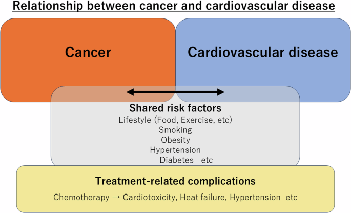 Cancer is the leading cause of death, followed by cardiovascular disease (CVD), which is the second leading cause of death in Japan. The relationship between cancer and CVD is increasingly recognized as a critical area of research in the field of cardio-oncology. Both diseases are leading causes of morbidity and mortality worldwide, and they share numerous overlapping risk factors and pathophysiological mechanisms [1]. Cancer and CVD are multifactorial diseases with highly overlapping risk factors, including smoking, obesity, metabolic syndrome, hypertension, diabetes, and inflammation. These commonalities suggest a bidirectional relationship where each condition can potentially influence the onset and progression of the other. For example, heart failure has been associated with an increased risk of cancer due to shared mechanisms such as inflammation and oxidative stress [2]. A study, examines the CVD mortality risk among US cancer survivors, which revealed that CVD mortality risk can surpass cancer mortality risk in certain cases and is particularly high shortly after cancer diagnosis [3]. Another study also revealed that adult cancer survivors have independently higher risk of CVD, especially heart failure [4]. In addition, cancer treatments, including chemotherapy, radiotherapy, and targeted therapies, have been shown to increase the risk of CVD complications. These treatments can lead to cardiotoxicity, manifesting as heart failure, arrhythmias, or coronary artery disease [5]. For example, anthracyclines and trastuzumab are well-known for their potential to cause heart damage by reducing cardiac pumping ability. It is important to monitor CVD in cancer patients before, during, and after treatment to mitigate long-term CVD risks. Conversely, there is emerging evidence that CVD itself may predispose individuals to cancer. The physiological stress associated with heart disease can promote tumor growth through mechanisms such as increased circulating inflammatory markers [2]. Additionally, some studies report that certain medications used in managing CVD, like angiotensin-converting enzyme inhibitors (ACEIs) and aspirin, have been linked to altered cancer risks [6]. The relationship between cancer and CVD has become clear, and care for both is important.
