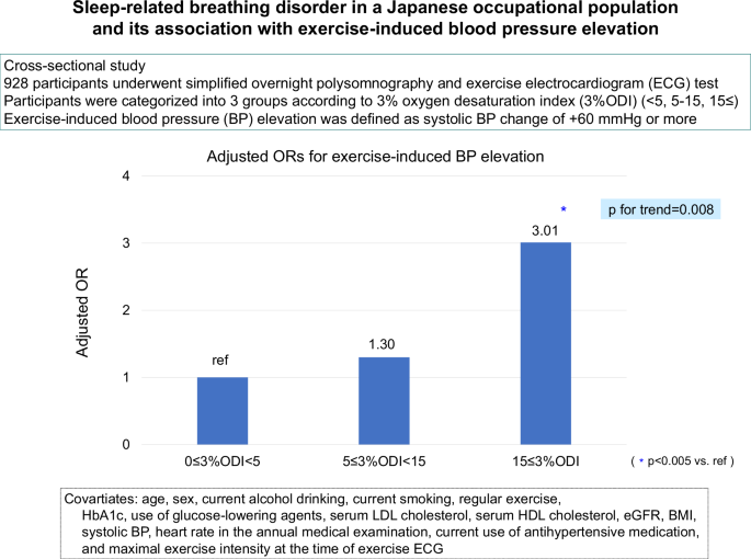 However, several limitations of this study should be noted. First, portable device monitoring for overnight SpO2 was used to evaluate SRBD in the present study. Full polysomnography assesses apnea/hypopnea per hour by comprehensively recording biological activities during sleep. In contrast, the portable monitor for overnight SpO2 does not record sleep, which means that apnea/hypopnea per hour is calculated using the total recording time as the denominator, not the total sleep time. As a result, the AHI may have been underestimated, suggesting that the frequency of mild/moderate SRBD may also have been underestimated [17]. On the other hand, this does not affect the results of the dose-response relationship for the association between elevated 3%ODI and exercise-induced BP elevation. Second, since exercise ECG tests were conducted by different cardiologists at each of the 7 facilities, the time of sustained exercise at maximal intensity may have differed among the participants. This is, the participating cardiologists may have differed in regard to how many seconds of sustained exercise they required after reaching THR (i.e., whether to continue to the end of the stage). Longer duration of exercise at maximal exercise intensity may have resulted in greater exercise-induced BP elevation. Third, the effect of the class of antihypertensive agents on the association between the severity of SRBD and exercise-induced BP elevation was not investigated. The effect of antihypertensive medications (RAA system inhibitors or beta-blockers) on exercise-induced BP change remains controversial; since lack of data prevented this analysis here, these antihypertensive medications may have influenced the results in the present study. Systolic BP during exercise was not significantly elevated with higher 3%ODI levels among those taking antihypertensive medications in the present study, which may indicate that antihypertensive medication has a suppressive effect on exercise-induced BP elevation. Further studies that have larger sample sizes that include the data on the class of antihypertensive drugs are warranted. Fourth, the association between the severity of SRBD and BP recovery after exercise was not investigated. Nevertheless, the Framingham study reported that both exercise-induced BP elevation and delayed BP recovery were independent risk factors for hypertension [7], and thus these two phenomena might be attributed to common underlying mechanisms. Thus, the assessment of post-exercise BP may provide useful information to infer the presence of excessive exercise-induced BP elevation in clinical practice. Fifth, selection bias may have occurred because we recruited study participants from among train and bus drivers of a company based in Japan. In addition, the generalizability of the present findings to populations with different genetic backgrounds and lifestyles may be limited. Finally, potential residual confounding factors, such as underlying cardiovascular or pulmonary disease, were not evaluated. Since this was a cross-sectional study, the causal relationship between 3%ODI elevation and exercise-induced BP elevation remains to be elucidated.
