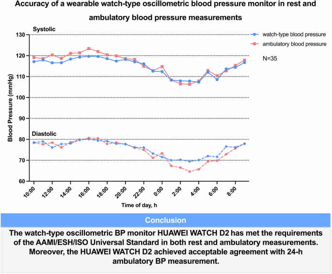 The aim of this study was to evaluate the accuracy of a watch-type oscillometric BP monitor HUAWEI WATCH D2 for rest and ambulatory BP measurements and compare with a conventional ambulatory BP monitor (A&D TM-2430, Tokyo, Japan). Subjects were recruited to fulfill the age, gender, BP and cuff distributions of the AAMI/ESH/ISO Universal Standard in the general population. Two cuffs of the test device were used for wrist circumference 13–16 (medium) and 16–21 cm (large), respectively. During the ambulatory validation study, subjects were asked to pedal at a low workload to elevate heart rate. For the 24-h ambulatory measurement, two BP monitoring devices were simultaneously worn on the same arm with the A&D cuff on the patient’s left arm and the HUAWEI WATCH D2 on the left wrist. In the study on rest BP measurement, 95 subjects were recruited and 85 were analyzed. For validation criterion 1, the mean ± standard deviation (SD) of the differences between the test device and reference BP readings was −1.6 ± 6.4/−1.9 ± 5.0 mmHg. For criterion 2, the SD of the mean BP differences between the test device and reference BP readings per subject was 5.8/4.7 mmHg. In the ambulatory validation study, the mean difference between the device and observers was −0.9 ± 7.3 mmHg and −0.7 ± 4.9 mmHg for systolic and diastolic BP, respectively. We also compared the 24-h BP data with the HUAWEI WATCH D2 and cuff-based A&D in 35 adults. The mean difference (±SD) in systolic/diastolic BP between the device and A&D were −1.1 ± 6.3/1.0 ± 4.2 mmHg, −2.0 ± 6.5/−0.2 ± 4.7 mmHg and 1.2 ± 6.7/ 4.2 ± 4.4 mmHg for 24-h, daytime and nighttime, respectively. The watch-type oscillometric BP monitor HUAWEI WATCH D2 has met the requirements of the AAMI/ESH/ISO Universal Standard (ISO 81060-2: 2018/AMD 1: 2020) in both rest and ambulatory measurements. Moreover, the HUAWEI WATCH D2 achieved acceptable agreement with 24-h ambulatory BP measurement.