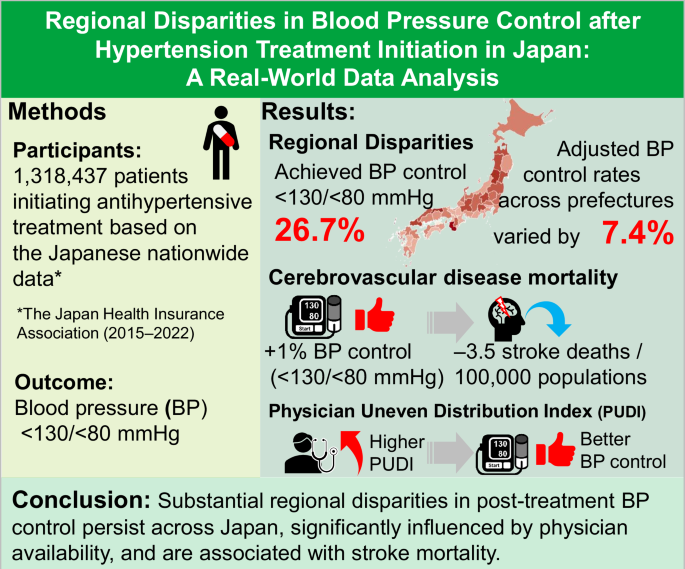 Globally, both geographic and socioeconomic disparities have been shown to significantly affect the prevalence and management [2, 6]. Geographic disparities in the quality and outcomes of hypertension management may exist across geographic regions within Japan, as suggested by official data showing regional variations in healthcare expenditures [7]. However, the regional disparities in the BP control rates remain inadequately characterized. As possible factors associated with regional disparities in BP control, pre-treatment characteristics, especially BP immediately before treatment initiation, are critical determinants of subsequent BP control [8]. Furthermore, regional differences in BP control may be directly influenced by healthcare-system-related factors. Understanding these disparities in the Japanese context, where healthcare access barriers are reduced relative to other countries’ healthcare systems, may reveal factors contributing to uncontrolled BP beyond traditional medical access issues [3]. The recent release of the Japanese Society of Hypertension Guidelines for the Management of Elevated Blood Pressure and Hypertension 2025 (JSH2025), recommending a universal target BP of <130/<80 mmHg regardless of age, makes a detailed understanding of these real-world disparities particularly urgent [9].
