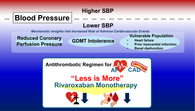 This post-hoc analysis provides a critical contribution to the contemporary “less is more” paradigm in antithrombotic therapy. Whereas previous studies have primarily addressed whether de-escalation strategies are safe and effective [3, 7], the present analysis addresses the equally important question of in whom de-escalation is most critical [4]. The optimal candidates do not appear to be low risk patients, but rather those at high risk and vulnerability, in whom the bleeding risk is greatest, and the potential net clinical benefit of simplified antithrombotic therapy is maximized. In the Low SBP group, rivaroxaban monotherapy conferred a dual advantage, reducing both the primary efficacy end point and major bleeding compared with combination therapy. The safety benefit, corresponding to a 60% relative reduction in major bleeding, is readily explained by the extreme vulnerability of frail patients with renal dysfunction and HF to bleeding under combination therapy. More noteworthy is the concomitant 40% reduction in MACE and death. This pattern is consistent with accumulating evidence that bleeding itself is a powerful trigger of subsequent ischemic and fatal events [8, 9]. In another post hoc analysis of AFIRE, major bleeding in patients with AF and stable CAD was associated with an approximately twofold higher incidence of subsequent MACE and an almost eightfold increase in risk within 30 days after the bleed [8]. Likewise, in a large percutaneous coronary intervention (PCI) cohort, spontaneous bleeding was independently associated with long term mortality, with a prognostic impact comparable to that of myocardial infarction [9]. In the Low SBP group of the present analysis, combination therapy substantially increased major bleeding relative to monotherapy; each bleeding event can lead to interruption of antithrombotic therapy, transfusion, hemodynamic instability, and chronic anemia. In patients whose coronary perfusion is already constrained by low perfusion pressure, anemia and instability are potent drivers of demand ischemia, including type 2 myocardial infarction and unstable angina. Thus, the apparent efficacy advantage of rivaroxaban monotherapy is likely mediated by the prevention of bleeding and its downstream consequences, whereas combination therapy may undermine ischemic protection through its own iatrogenic harm.