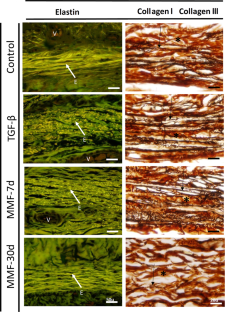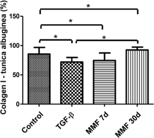 The aim of the present study was to evaluate the histological, histochemical, and stereological changes caused by mycophenolate mofetil (MMF) on the tunica albuginea of rat penises submitted to an injection of transforming growth factor beta (TGF-β) for the induction of Peyronie’s disease (PD). Twenty adult male Wistar rats were divided into four groups: Control group; TGF-β group (TGF-β injection); MMF-7d group (treated with MMF 7 days after induction with TGF-β); and MMF-30d group (treated with MMF 30 days after induction with TGF-β). The steorological evaluation included the relative volume of different types of connective fibres of the tunica albuginea. The histochemical analysis revealed the fragmentation and degradation of elastin in the tunica albuginea. This process was partially reversed in the MMF-7d group and a situation very close to normality was observed in the MMF-30d group. In the collagen III/collagen I ratio it was observed increase in this ratio in the TGF-β (59.4 ± 5.53) and MMF-7d (49 ± 18.2) groups and a decrease in the MMF-30d group (28.7 ± 4), approaching normality. The injection of TGF-β promoted fibrotic alterations in the penile tunica albuginea in Wistar rats corresponding to PD. In this model, MMF acts as a regenerating anti-fibrotic agent.