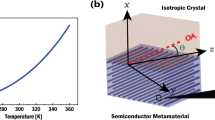 InSb forms an ideal thermally tunable system due to its low bandgap (E g = 0.17 eV at 300 K), low conductivity effective mass (\(m_{\rm{e}}^*{\rm{ = }}0.014{m_0}\) at the conduction band minimum at 300 K)27 and high refractive index (n = 4). Through moderate doping (1016–1019), the infrared permittivity of InSb can be continuously engineered between high refractive index (ε R ~ 16) and plasmonic (ε R < 0) regimes according to simple Drude models28.