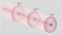 where q 0 = 2π/p is the equilibrium chiral wavenumber, K 11, K 22 and K 33 are Frank elastic constants that pertain to splay, twist and bend distortions of n(r), respectively, Δε is the dielectric anisotropy (Table 1) and integration is over the sample’s volume. Since the boundary conditions at the confining substrates used in experiments are strong and always satisfied14, W contains only the bulk terms of free energy and the surface energy does not enter this minimization problem (we note that the baby skyrmions can be also realized in cells with weak perpendicular boundary conditions15, but this type of cell confinement is outside the scope of the present study). The energy-minimizing configurations of baby skyrmions (Fig. 2d–f), which emerge from a competition of LC elasticity and the dielectric coupling of n with electric field E, are consistent with the POM micrographs (Fig. 2a–c).