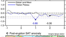 The ATM, LAND and OCEAN experiments were respectively designed to represent the effect of aerosol forcing through its direct impact on the atmospheric structure (ATM), and indirect impacts through changes in land (LAND) or ocean (OCEAN) surface temperatures. The ATM and LAND scenarios were developed using the same protocol as in ALL but with prescribed daily SST from the Control members (i.e., with a SST that excludes the impact of volcanic aerosol forcing). Volcanic aerosol forcing is included in the ATM experiments, but the surface albedo in this experiment is modified so that continental surfaces do not cool in response to volcanic forcing (details below). In LAND, there is no prescribed aerosol forcing, but the albedo modification enforces a land surface cooling that is consistent with that of the Pinatubo coupled model experiment. This strategy has the advantage of allowing surface land temperature to vary in the presence of SST anomalies (in the OCEAN experiment), as is seen in other model experiments in the context of global warming scenario37, 38. This is hence more physically relevant than experiments that constrain land surface temperature19 and which can result in unphysical and exaggerated land cooling, and hence exaggerated land–ocean gradients. We modify the land surface albedo to restore the atmospheric temperatures over land to that of the Control coupled model ensemble in ATM and to that of the Pinatubo coupled model ensemble in LAND.