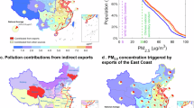 We applied the GEOS-Chem model (v10-01) to simulate the spatial change ratios of PM2.5 concentrations attributable to individual activities (e.g., international export, interprovincial trade) across China at a resolution of 0.5° latitude × 0.667° longitude (a nominal resolution of ~ 50 km). The spatial change ratios between baseline PM2.5 concentrations and the five alternative simulated results are considered as the impacts of various types of trade activities on PM2.5 concentrations (Supplementary Fig. 1). The calculated spatial change ratios are then multiplied with satellite-retrieved PM2.5 concentrations to calculate the individual trade-derived ambient PM2.5 concentrations across China: