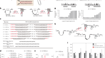 The JASCO J815 spectropolarimeter was used to collect CD spectra. The oligonucleotides were dissolved in the same buffers as for NMR studies. Quartz cuvettes with a path length 0.5 cm were used with the sample volumes of 1300 μl to achieve a sample concentration of 4.3 μM. Spectra were collected in the range between 220 and 340 nm at 25 °C from three scans and a buffer baseline was subtracted from each spectrum. CD was expressed as the difference in the molar absorption of the right-handed and left-handed circularly polarized light. Δε, in units of cm2 mmol−1, was normalized to the number of nucleoside residues in the RNA samples49.