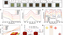 The synthesis of oleic acid-capped PbS QDs follows published methods26. For methylammonium lead triiodide (MAPbI3) perovskite ligand exchange, 5 ml of purified oleic acid-capped QD octane solution (20 mg ml−1) was mixed in a vial with 5 ml of dimethylformamide (DMF) solvent containing equimolar amounts of MAI and PbI2 (0.3 mol l−1). The solution was mixed vigorously at room temperature for about 10 min to ensure complete ligand exchange; a successful exchange results in a dense, black solution in the DMF layer. The octane layer was decanted and an additional 5 ml of octane was added and vortexed with DMF solution to wash the residual oleic ligands. This purification process was repeated twice. Next, the QD DMF solution was transferred into two test tubes (~2.5 ml each). Approximately 1.5 ml of toluene was slowly added into each tube to precipitate the QDs. This results in a translucent, dark brown solution. The precipitate was isolated by centrifugation at 6000 rpm for 2 min and the supernatant was decanted. The precipitate was dried under vacuum at room temperature for 20 min and finally redispersed by adding the predesigned amount of dry butylamine to form a concentrated ink (e.g., 188 mg ml−1 for the preparation a QD film with a thickness of around 300 nm).