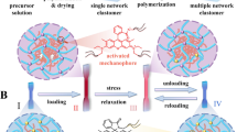 Sonication of polymers results in both mechanophore-based chemistry and non-selective backbone fragmentation32, which reduces the average molar mass of the polymer sample (Fig. 5c and Supplementary Fig. 18). Such competing selective and non-selective mechanochemical bond scission is thought to mimic the response of polymer chains in bulk materials under mechanical load34,44,52. Reuse of a degraded material requires restoration of its mechanical properties35, which can be achieved by reforming some of the lost load-bearing bonds. To demonstrate optical regeneration of load-bearing bonds in mechanically degraded samples of P2, we sonicated a solution of P2 for 4 h to dissociate 36% of the dimers and to approximately halve its number-average molar mass. After removing the solvent, we split the degraded polymer in two parts, one of which was irradiated by 365 nm light (1.68 W cm−2) for 3 h. The untreated solid remained soluble in tetrahydrofuran whereas the irradiated one was partially insoluble in tetrahydrofuran, acetone, dimethylformamide or dichloromethane (Fig. 5d and Supplementary Fig. 19), suggesting mechanochemically generated cinnamates in the polymer backbones underwent photochemical [2 + 2] cycloaddition to form cyclobutane cross-links. This conclusion is supported by the appearance upon sonication of P2 of an IR resonance at 1640 cm−1, which was previously associated with the cinnamate moiety29,62,63, and its disappearance upon irradiation of the sonicated sample at 365 nm, suggestive of photochemical dimerization of mechanochemically generated cinnamates (Supplementary Fig. 20). Changes in the mechanical properties of films of P2 before and after sonication, and after sonication and optical healing, measured under macroscopic uniaxial tensile loading, are also consistent with mechanochemical dissociation of the dimers and their subsequent photodimerization. Thus, sonication of P2 reduced its elastic modulus and ultimate strength 1.5 ± 0.2 and 3.1 ± 0.5-fold, respectively (Supplementary Fig. 21 and Supplementary Table 2), which is an expected outcome of backbone scission. In contrast, subsequent UV irradiation increased these parameters 3.9 ± 0.2 and 4.8 ± 0.7-fold, respectively. These results illustrate that the macrocyclic dimers allow optical regeneration of mechanically damaged volumes of polymers even when the damage is caused by fragmentation of backbones.