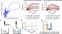 Each of the six RBD classes were also characterized using a neutralizing mouse monoclonal antibody (9.8E12) that we generated against the HCoV-229E reference strain (Class I). As shown in Fig. 4e, f, 9.8E12 inhibits HCoV-229E infection of the L132 cell-line. This antibody binds to the Class I RBD with a K d of 66 nM (k on = 6.3 × 105 M−1 s−1, k off = 0.041 s−1) and as shown by a competition binding experiment, it blocks the RBD–hAPN interaction (Supplementary Fig. 8A, B). In contrast, 9.8E12 shows no binding to the other five RBD classes at a concentration of 1 μM (Supplementary Fig. 8C), strong evidence that the receptor-binding loops of the Class I RBD are important for antibody binding and that loop variation can abrogate antibody binding. Consistent with this observation, non-conserved amino-acid changes both within and outside of the RBD–hAPN interface are observed across all classes (Supplementary Table 2).