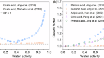 Subsequent experiments on more complex mixtures (see Fig. 6) were carried out on samples coated inside 1.5-mm-diameter glass capillary tubes. Oleic acid, sodium oleate, fructose ((3S,4R,5R)-1,3,4,5,6-pentahydroxyhexan-2-one) and hexadecane were dissolved at 10 wt% in ethanol (oleic acid and hexadecane) and methanol (fructose and sodium oleate), respectively. Oleic acid and hexadecane dissolved readily on vortexing. Fructose and sodium oleate were sonicated in methanol for 5 min, and the fructose solution was then warmed to 45 °C while shaking for 2 h to ensure complete dissolution. The solutions were combined in the volume ratios oleic acid:sodium oleate:fructose 1:1:1.8 and oleic acid:sodium oleate:fructose 1:1:1.8:0.6 to mimic the aerosol composition found by Wang et al. for Chongqing in winter52. Approximately 50–80 mL of the solution was introduced into a 1.5-mm-diameter thin-walled glass capillary tube embedded in a metal cylinder (custom-made at B21 beamline) and gently warmed while tipping the capillary backwards and forwards to produce a coating. The tube was then placed in a vacuum oven at 50 °C for at least an hour to ensure evaporation of ethanol and methanol. This produced a coating on average of 0.1-mm thickness (estimated assuming distribution over a capillary tube section of length 1 cm), although considerable variations in thickness could be seen visually. For humidity control, the tube was connected to a nitrogen line, either via a water bubbler for high humidity (>95% RH) or directly, for low humidity (<20% RH), and analysed using SAXS on beamline B21 at the Diamond Light Source.