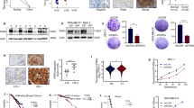 Parkin expression has been reported to be frequently decreased in cancer, including breast cancer9, 14, 16. Consistently, we found that Parkin protein levels were significantly lower in breast cancer samples (n = 120) compared with non-tumor breast tissues (n = 48) in a tissue microarray (TMA; TMA-BR2082a from US Biomax) as examined by immunohistochemistry (IHC) staining (Fig. 1a). Analysis of breast cancer data sets from The Cancer Genome Atlas (TCGA) showed that Parkin mRNA levels were significantly decreased in breast cancer specimens compared with paired adjacent non-tumor tissues (n = 113; Fig. 1b). The Parkin downregulation was not linked to any specific breast tumor subtype in terms of ER, PR or HER2 status (Supplementary Fig. 1a). Compared with normal breast tissues and normal breast MCF10A cells, Parkin expression was decreased in various breast cancer cells, including MCF7 (ER + /PR + /HER2−), MDA-MB231 (ER−/PR−/HER2−), T47D (ER + /PR + /HER2−), SK-BR3 (ER−/PR−/HER2+), and ZR-75-1 (ER + /PR + /HER2+) (Supplementary Fig. 1b). On the basis of the data sets from cBioportal18, 26, Parkin mutations are observed in < 1% of breast cancer, suggesting that mutation is not a major mechanism contributing to the frequent downregulation of Parkin in breast cancer (Supplementary Fig. 1c). Results from Kaplan–Meier plotter, an online survival analysis tool (http://kmplot.com)27, showed that low Parkin mRNA expression in breast cancer was significantly associated with poor prognosis of patients (n = 3951; Fig. 1c). These results suggest an important role of Parkin in breast cancer.