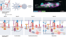 Mice were immunized with 0–10 μg of antigen (ovalbumin, Catalog number A5503, Sigma-Aldrich, St. Louis, MO or ovalbumin labeled with Alexafluor 488 catalog number A20100, Sigma-Aldrich, St. Louis, MO) with 1–2 μg poly(I:C) (catalog number VAC-PIC, Invivogen, San Diego, CA), and 1–2 μg anti-CD40 (clone FGK4.5, BioXCell, West Lebanon, NH)61,62 per site into five sites subcutaneously (footpads, flanks, scruff) or infected with VV-ova intraperitoneally 1 × 107 pfu/mouse or subcutaneously 1 × 104 pfu/footpad24 1–32 days prior to OT1 T-cell transfer. CD45.1 congenically marked OT1 T cells were isolated by the mouse CD8 isolation kit by Stem Cell Technologies (catalog number 19853, StemCell Technologies, Canada). Greater than 90% CD8 T-cell purity was obtained by this method. After isolation, OT1s were labeled with VPD (catalog number 562158, BD Biosciences) and 2 × 105–1 × 106-labeled T cells were transferred into immunized C57BL/6 mice (CD45.2). Three days post transfer, mice were killed and spleens and draining LNs were harvested. Tissues were macerated with glass slides, red blood cells lysed with ACK (Ammonium–Chloride–Potassium) buffer, and stained with CD45.1 APC clone A20 (1:200), CD45.2 Alexafluor 488 clone 104 (1:200), B220 brilliant violet 510 clone RA3-6B2 (1:400), CD8 APC-Cy7 clone 53–6.7 (1:400), CD44 PerCP-Cy5.5 clone IM7 (1:400), and Vβ5.1,5.2 PE clone MR9-4 (1:300) to assess transferred OT1 T-cell proliferation (Supplementary Fig. 3). Determination of the cells divided (percent dividing cells) was calculated as previously described63 using the equation fraction diluted \(= \mathop {\sum}\nolimits_1^i {\frac{{N_i}}{{2^i}}} /\mathop {\sum}\nolimits_0^i {\frac{{N_i}}{{2^i}}}\) where i is the generation number (0 is the undivided population), and N i is the number of events in generation i.