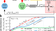 Quantum sensing applications also require the ability to disambiguate changes in the measured operational fidelity due to target signals within a single quadrature, e.g., Ωσ x , from alternate “interfering” sources, which may be manifested similarly in projective measurements. For instance, the presence of a Hamiltonian term ∝σ z during a driven operation ∝σ x will reduce the measured fidelity of the driven operation in a manner similar to the presence of noise only proportional to the control30. Consequently, a single measurement is insufficient to determine which process is at play. To detect and compensate for such effects, we use tomographic reconstruction35, by preparing the qubit state along the three Cartesian directions, applying DPSS control, and performing independent sequential measurements in the corresponding bases (Fig. 3c). In our experiments, we simultaneously apply a target signal ∝σ x as above, and an additional white dephasing term ∝σ z , which contributes to the sensor’s overall response in a way that obfuscates the measurement of the target. We then isolate the target signal’s contribution by combining three projective measurements as \({\cal S}\) ≡ (1 + P(↑ x ) − P(↑ y ) − P(↑ z ))/2, as derived in the Supplementary Note 3. Reconstructed values of \({\cal S}\) (red markers, Fig. 3c) reproduce the results expected without any σ z -terms well (red line), successfully correcting for a vertical offset that would otherwise bias a spectral estimate.