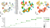 All mass cytometry reagents were purchased from Fluidigm Inc. (former DVS), unless otherwise noted. Mice were injected intraperitoneally with 1 mg IdU per mouse 16 h prior to the experiment. Lymph nodes were removed and mammary glands were digested using the Miltenyi Fatty Tissue Digestion Kit. Cells were then washed with PBS containing 1% BSA and blocked with Fc-blocking reagent (eBioscience) to minimize non-specific antibody binding. Cells were stained with a panel of metal-labeled antibodies against 20 cell surface markers (Fig. 5, Supplement Fig. 1A) for 30 min on ice and then washed. All antibodies were either purchased pre-conjugated to metal tags or conjugated in-house using MaxPar X8 Conjugation Kits according to the manufacturer’s instructions. After antibody staining, cells were incubated with cisplatin for 5 min at room temperature as a viability dye for dead cell exclusion. Cells were then fixed and permeabilized with a commercial fix/perm buffer (BD Biosciences) and stored in PBS containing 1.6% formaldehyde and a 1:4000 dilution of Ir nucleic acid intercalator to label all nucleated cells. Immediately prior to acquisition, cells were washed in PBS, and diH2O, and resuspended in diH2O containing a 1/10 dilution of EQ 4 Element Calibration beads. After routine instrument tuning and optimization, the samples were acquired on a CyTOF2 Mass Cytometer in sequential 10 min acquisitions at an acquisition rate of <500 events/s. The resulting FCS files were concatenated and normalized using a bead-based normalization algorithm in the CyTOF acquisition software and analyzed with Cytobank. FCS files were manually pre-gated on Ir193 DNA+ CD45+ events, excluding dead cells, doublets, and DNA-negative debris. Myeloid-derived cells were manually gated based on CD11c and CD11b expression and the gated myeloid populations were then analyzed using viSNE36 based on all myeloid phenotypic markers. Putative cell populations on the resulting viSNE map were manually gated based on the expression of canonical markers, while allowing for visualization of additional heterogeneity within and outside the labeled population bubbles.