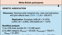 where \(G\) is a SNP that was coded additively, \(E\) is the raw vitamin D intake, measured on a continuous scale. The parameters \(\beta _0\), \(\beta _1\), \(\beta _2\), and \(\beta _3\) are the intercept, the main effect of SNP, the main effect of dietary vitamin D intake, and the interaction effect between \(G\) and \(E\). The model also included the same covariates \({Z}\) as for the marginal effect screening, the effects of which were captured in the parameter \({{\beta }}_{{Z}}\). We considered both a standard 1 degree-of-freedom test of interaction effect (i.e., null hypothesis of \(\beta _3 = 0\)), and a joint 2 degree-of-freedom test of main genetic effect plus gene-by-diet interaction (i.e., null hypothesis of \(\beta _1 = 0\) and \(\beta _3 = 0\)). For comparison purposes, we also considered a model adjusting for vitamin D intake but not modeling interaction (i.e., not including the \(\beta _3 \times G \times E\) term) using the same subset of individuals.