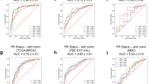 We used R package glmnet (v2.0)43 for constructing a logistic regression model using RNA-seq data in our cohort. Leave-one-out cross validation was performed for finding robust coefficients. Taking the independent validation cohort, linear combination of gene expression levels using the coefficients (gene expression signature) were obtained to rank the patients. Measuring sensitivity and specificity of LN-status prediction with varying threshold gives a receiver-operating characteristics (ROC) curve from which area under the curve (AUC) can be measured. A threshold dividing high- and low-risk group was chosen as the median. We used potential target genes of ERα and FOXA1, and union of potential targets to construct three classification models. Note that due to the high dimensionality, no contributing gene is found when the model is trained with whole genome data.