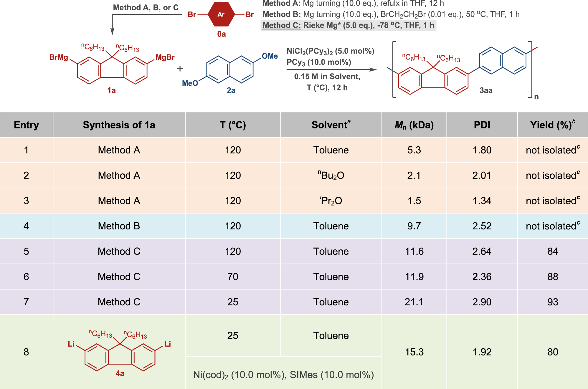 Table 1 Screening of reaction conditions for Ni-catalyzed cross-coupling polycondensation between Grignard reagent 1a and 2,6-dimethoxynaphthalene 2a